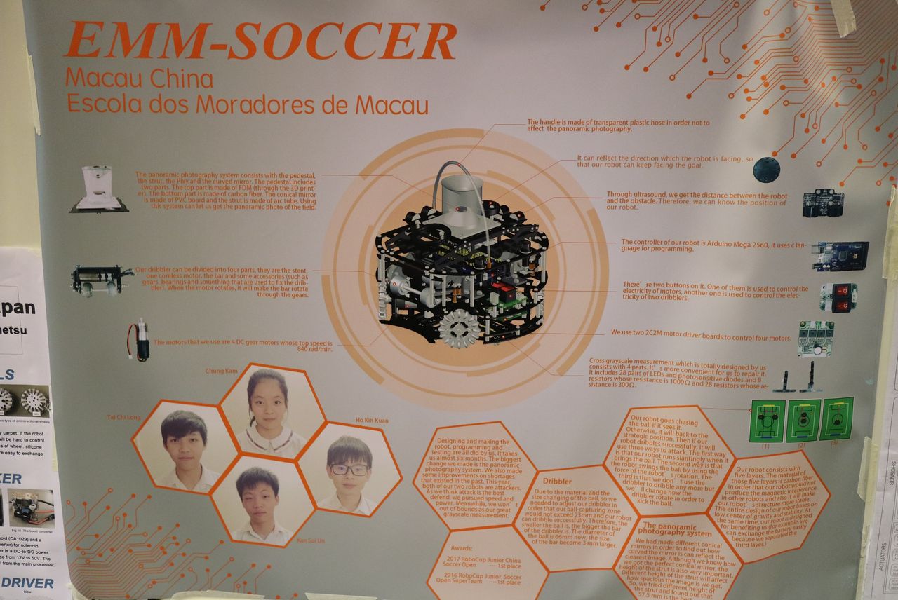 みなさんが良く「マカオ」と呼んでいるチームの一つです.マカオにはロボカップジュニアサッカーの強豪校が4校あって,去年のジャパンオープンの招待されていたチーム「Frantic Robot」も,その中の一つです.このチームはほぼ毎年全国大会に出場している気がします.去年はぶっちぎりで試合成績1位でした.恐らくそのせいで今年からコールドゲームのルールが追加されたのではないかと思います.