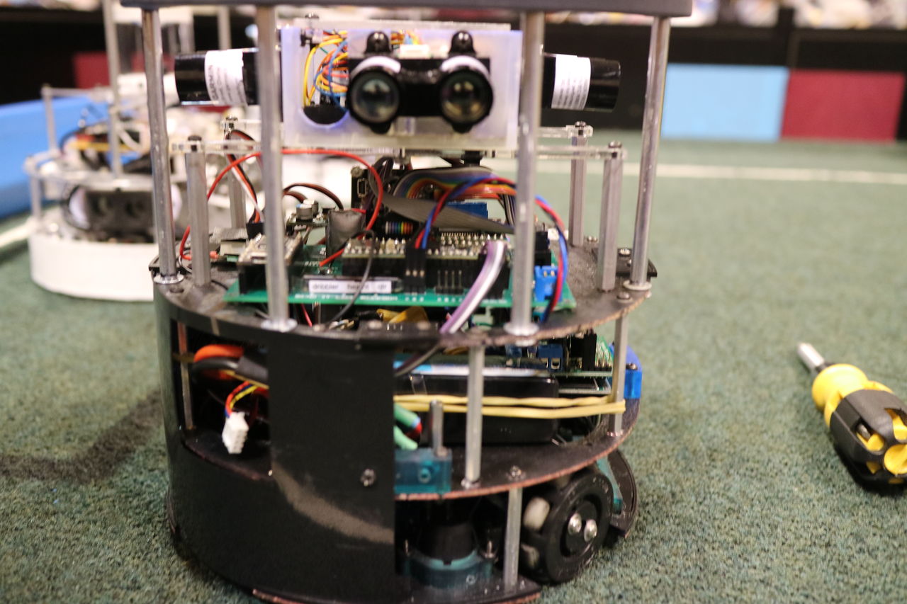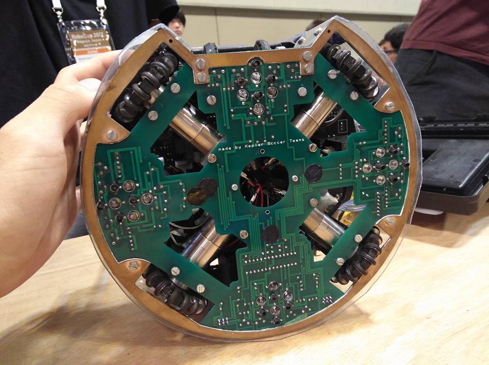 写真は奇跡的に僕がスマホをなくす前にFacebookにあげていたので残っていた写真です.見ての通りシャシはフルカーボンです.ドリブラーは前後についています.全方位カメラのカメラはPIXYで,その周辺はTADA君のロボットにめちゃめちゃそっくりです笑 メインマイコンはArduino MEGAでした.足回りのモータはFaulhaberの2342シリーズでドリブラーのモータはブラシレスです.モタドラは自作で超音波と方位センサはジョンミンです.バッテリーはモータ駆動用とマイコン用で分けていました.