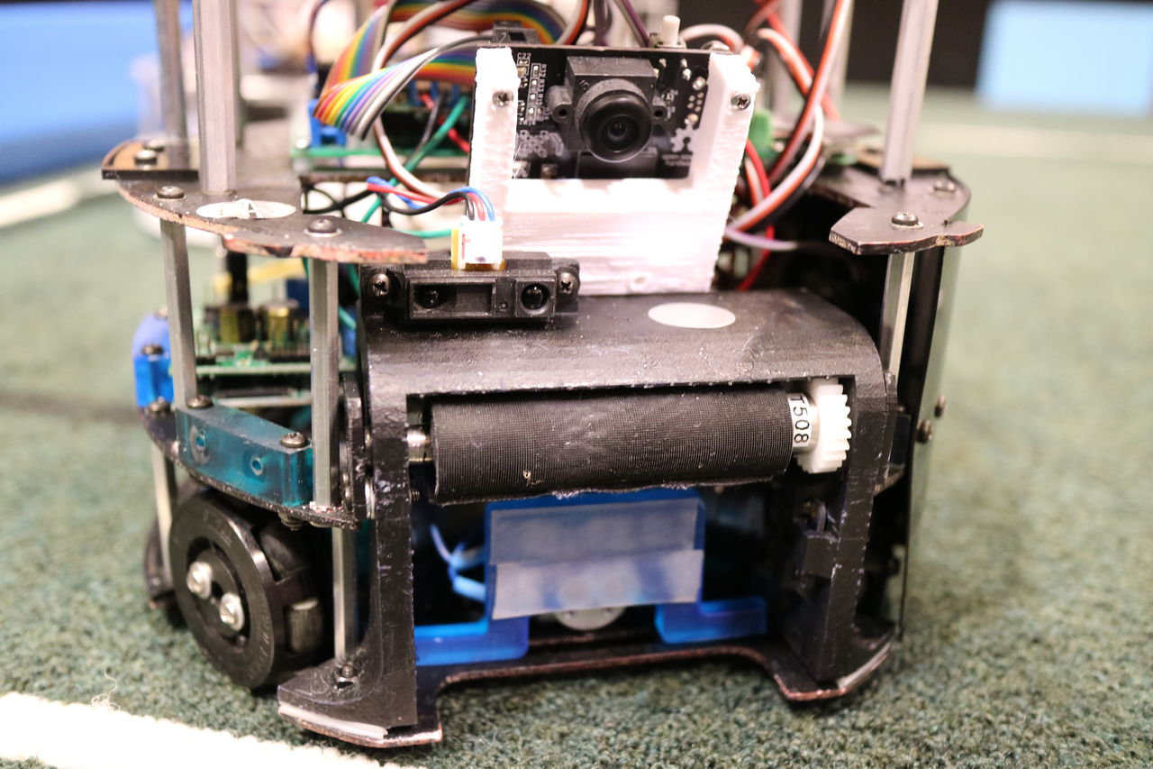 試合動画はこちらロボットですが1枚基板2枚で構成されていてめちゃめちゃかっこいいです.このチームはボールをドリブルしながら,ラインをライントレースして壁方向にボールを隠しながら,ゴールまで近づきシュートするという,誰もが(少なくとも僕らは)憧れた方法を実現していました.ラインセンサは写真のようにライントレースをできるような作りになっています.ドリブラ,足回りのモータは共にmaxonのREシリーズ(22?忘れてしまいました...)です.メインマイコンはNucleo,カメラはOpen MV,全方位カメラのミラーはミラーテープで作っていました.距離センサはシャープのPSD,モタドラはL6203 でした.